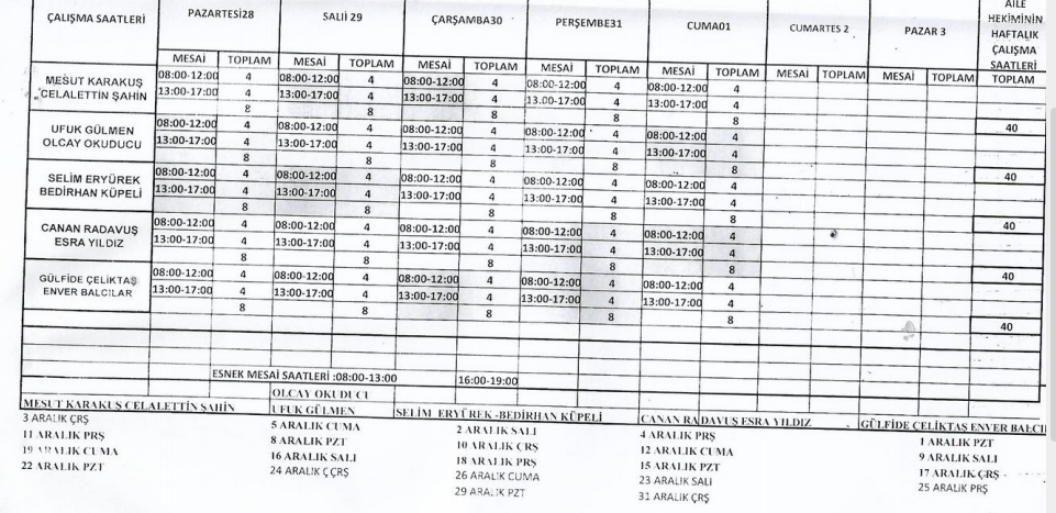 ARALIK 2025 ESNEK MESAİ ÇİZELGESİ