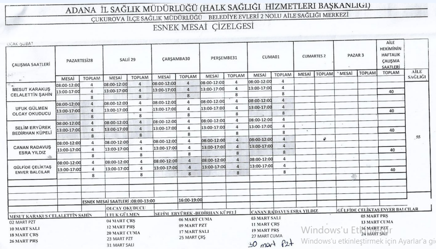 MART 2026 ESNEK MESAİ ÇİZELGESİ